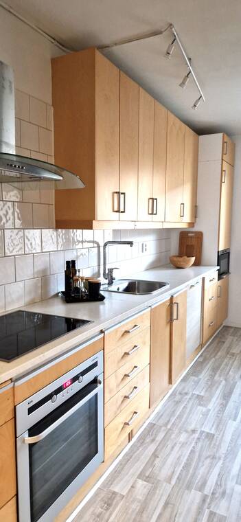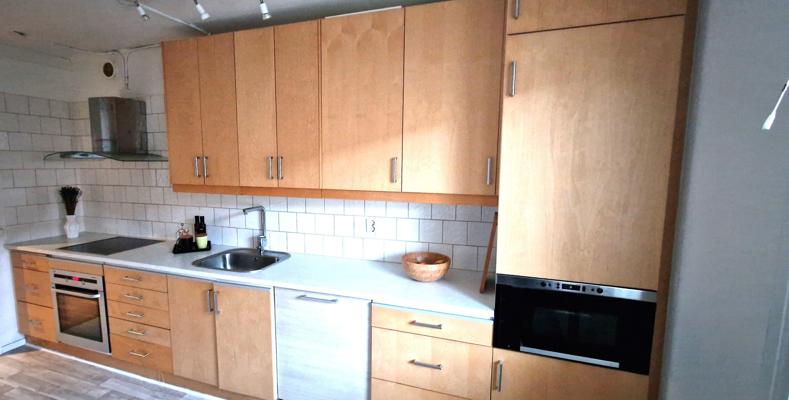 Kök med parkettgolv, köksnickerier av ljust träslag. Spis med glaskeramikhäll. Kolfilterfläkt, diskmaskin, inbyggd microvågsugn och kyl/frys. Bra matplats med plats för 4-8 personer. Fönsterbräda i marmor.
