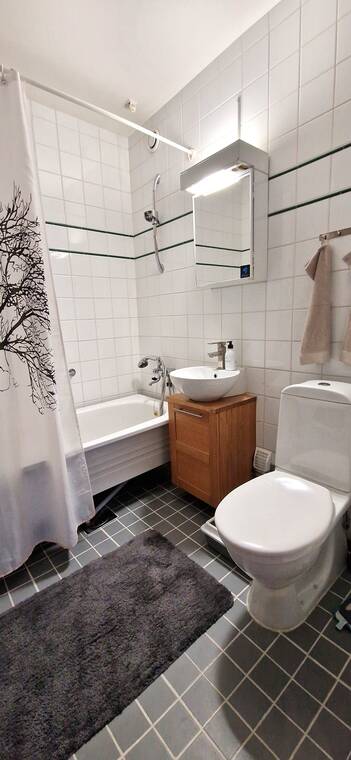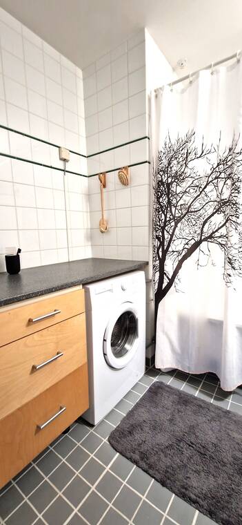 Fräscht och rymligt badrum med klinkergolv, kakelväggar och tvättmaskin med arbetsbänk ovanpå. Handfat, badrumsskåp med spegel, wc och ett nytt badkar.