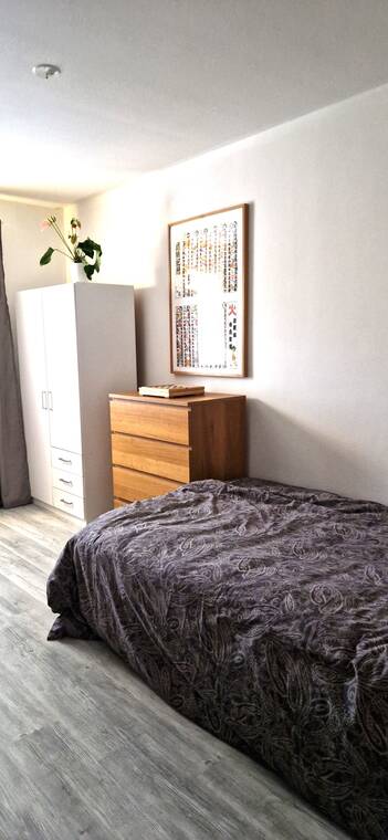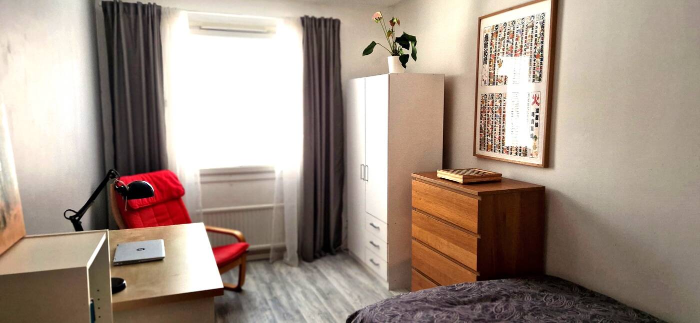 Sovrum med laminatgolv med plats för dubbelsäng. Skrivbordet, fåtöljen och garderoberna lämnas om så önskas.