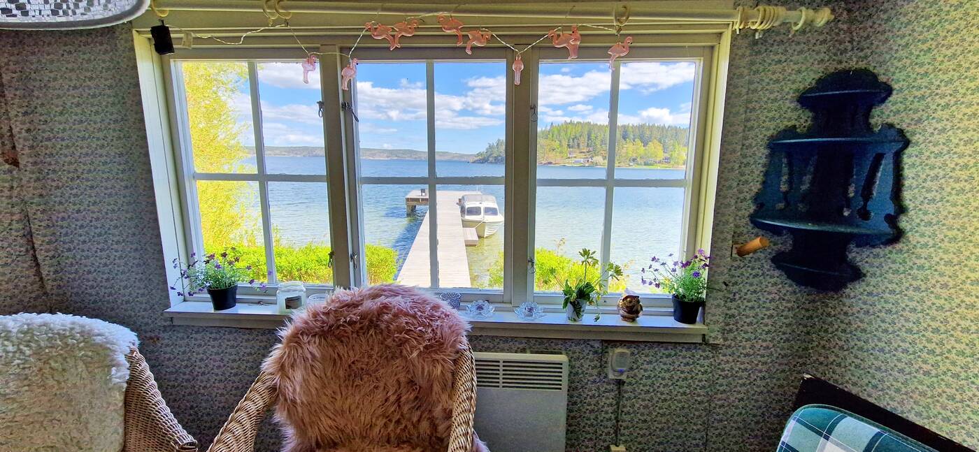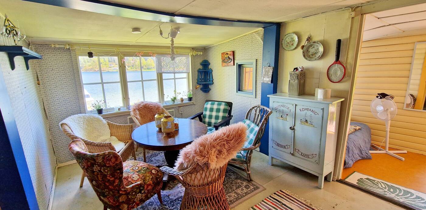 Vardagsrum med sittgrupp och härlig utsikt över Östersjön och den intilliggande naturen.