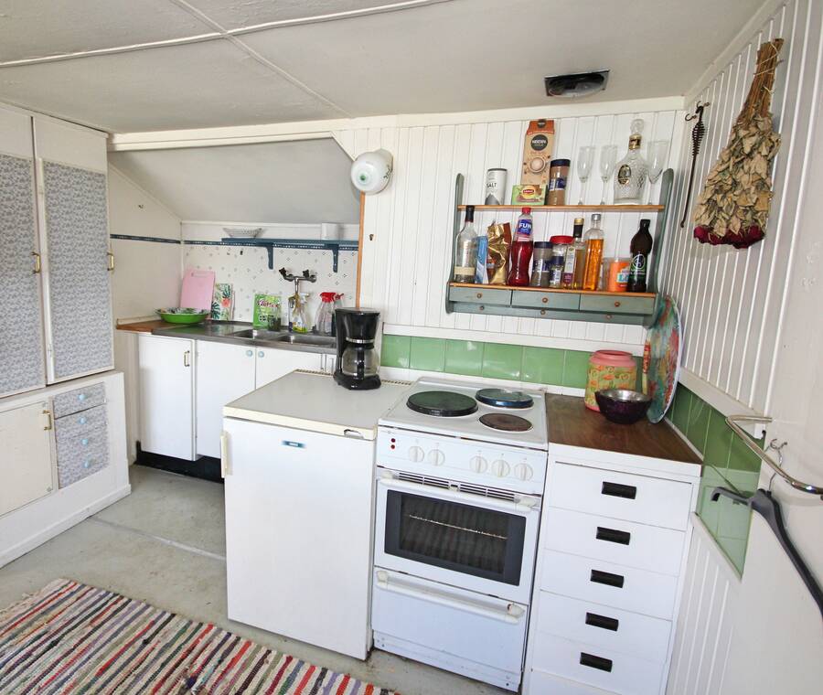 I anslutning till vardagsrummet ligger köket med kyl och frys samt en elspis och diskbänk.